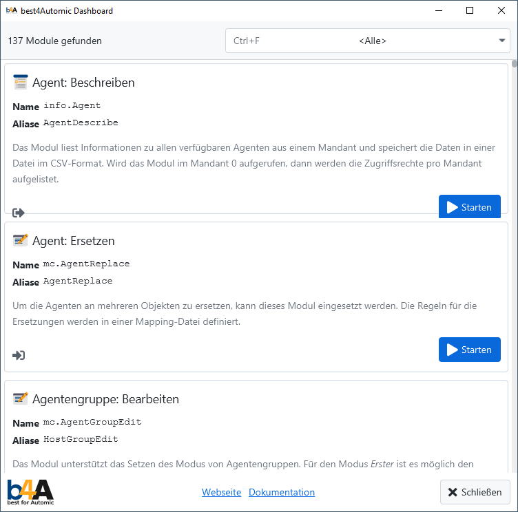 kann eine Liste aller verfügbaren Module angezeigt werden. Diese kann ebenfalls mit dem grafischen b4A Dashboard bezogen werden.