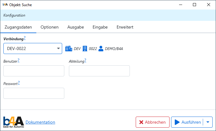 -C, --connection * Definiert die b4A-Verbindung bestehend aus Server, Port, Mandant und optional Zugangsdaten
