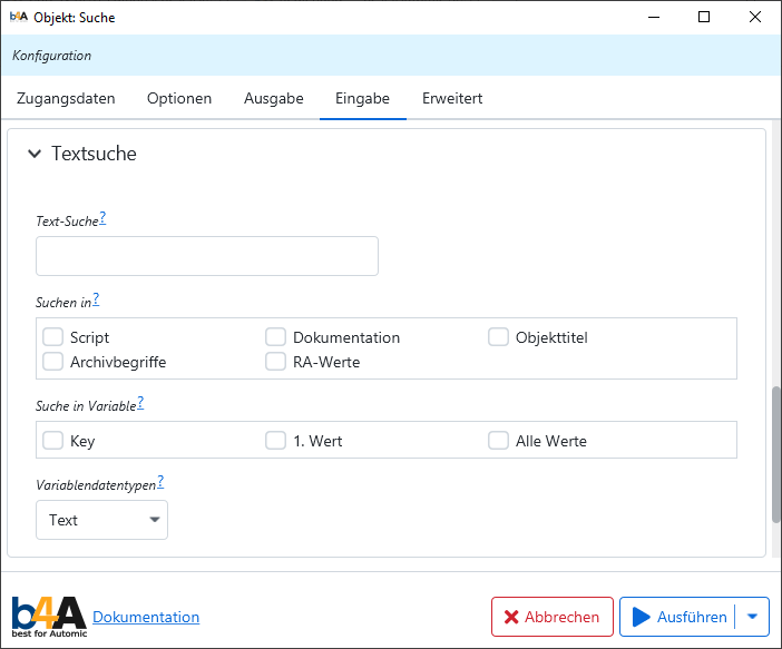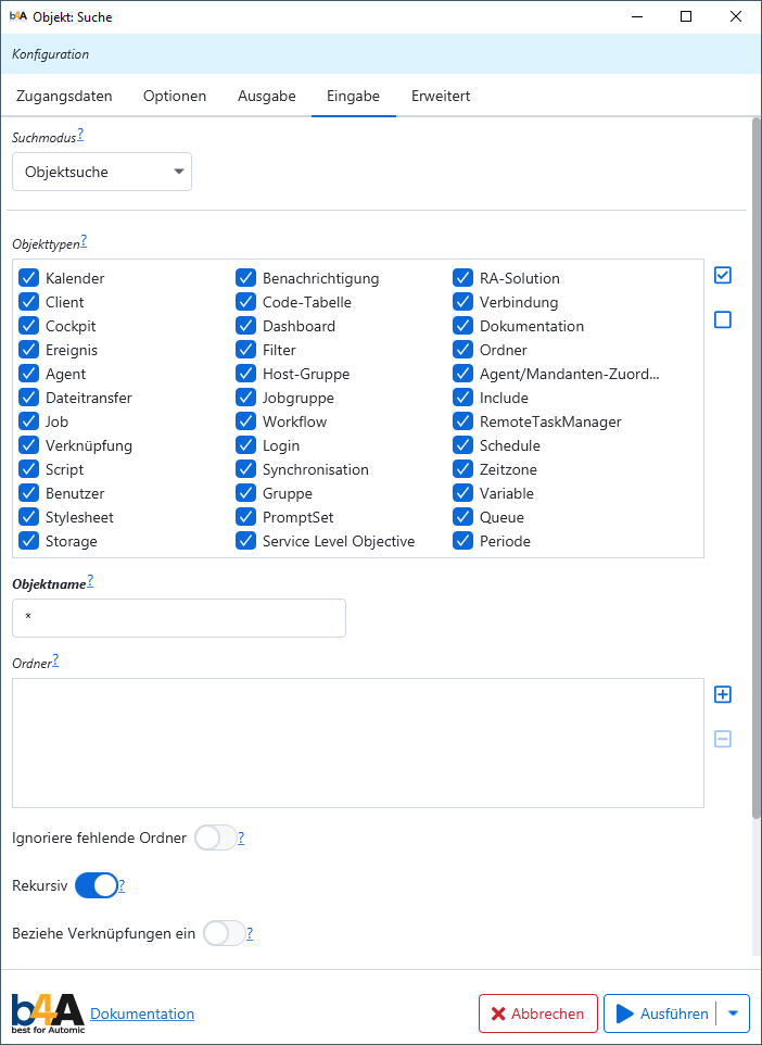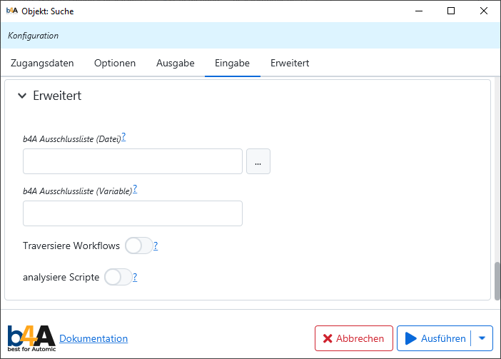 Die vierte Variante wird genutzt, wenn Module b4A-Objektlisten als Ausgabe erzeugen. Diese Dateien können auch als Eingabe genutzt werden. Dabei wird der enthaltene Objekttitel allerdings nicht als Kriterium für die Auswahl genutzt. Bei Verwendung als Eingabedatei werden doppelte Einträge in der Datei automatisch ignoriert.