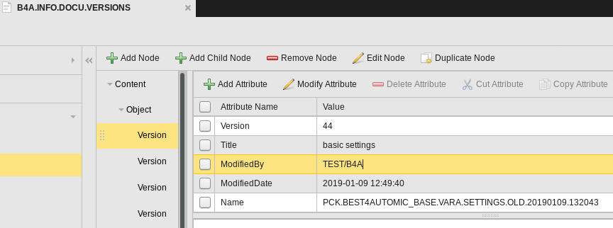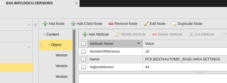 The structured documentation is organized in such a way that version information can be saved for several objects. An Object node is created at the first level. The following details are stored in the attributes: